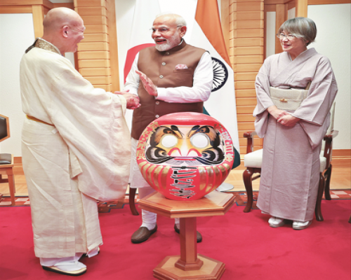 In a highly symbolic and culturally rich gesture, Prime Minister Narendra Modi was presented with a traditional Daruma doll by Rev. Seishi Hirose, the chief priest of the Shorinzan Daruma-Ji Temple in Takasaki, Gunma Prefecture. This exchange underscored the profound spiritual heritage shared between India and Japan.