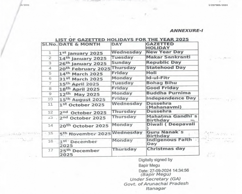 Arunachal Pradesh Govt Holidays List 2025
