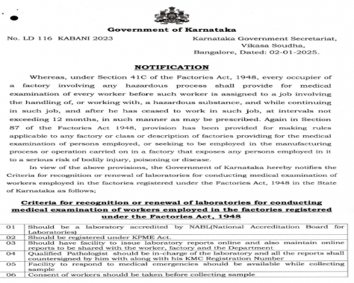 Criteria for recognition or renewal of laboratories for conducting medical examination of workers employed in the factories registered under the Factories Act, 1948