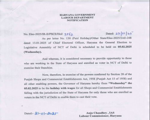 Delhi - Declaration of Paid Holiday in Haryana Due to General Elections - 22-1-2025
