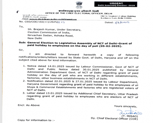 General Election to Legislative Assembly of NCT of Delhi-Grant of paid holiday to employees on the day of poll (05-02-2025).
