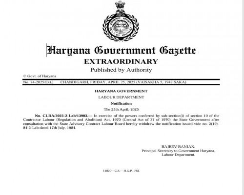 Haryana Government Gazette - CLRA Act, 1970 -Notification The 25th April, 2025