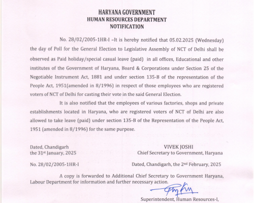 Haryana Notifications- Declaration of paid holiday in haryana due to general elections in delhi on-05th-feb-2025