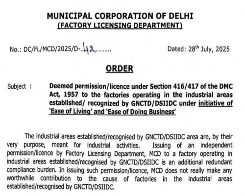Under the new rule, factories operating in industrial areas recognized by GNCTD/DSIIDC will no longer be required to obtain a separate license from the Municipal Corporation of Delhi (MCD). Instead, documents such as MSME Udyam Registration or the Allotment Letter/Lease Deed issued by GNCTD/DSIIDC will be considered valid licenses under Sections 416 and 417 of the DMC Act.