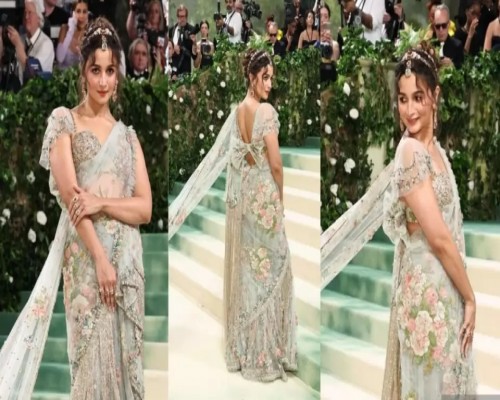 आलिया भट्ट ने मेट गाला 2024 के इवेंट में हाथ से कढ़ाई की गई साड़ी के साथ कानों में रत्न की बालियां, माथा पट्टी, हाथों में अंगूठियों और न्यूड मेकअप के साथ अपने लुक को पूरा किया था. इस दौरान उन्होंने मेसी हेयर बन बनाया था जो उनके लुक में चार चांद लगाने का काम किया.