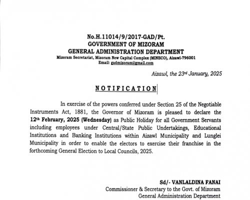 NOTIFICATION Mizoram - Declaration of Public Holiday in Mizoram General Elections - 23-1-2025