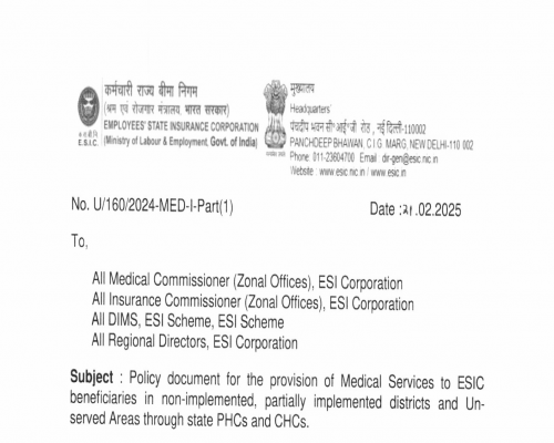 Policy document for the provision of Medical Services to ESIC beneficiaries in non-implemented, partially implemented districts and Unserved areas through state PHCs and CHCs -New Delhi